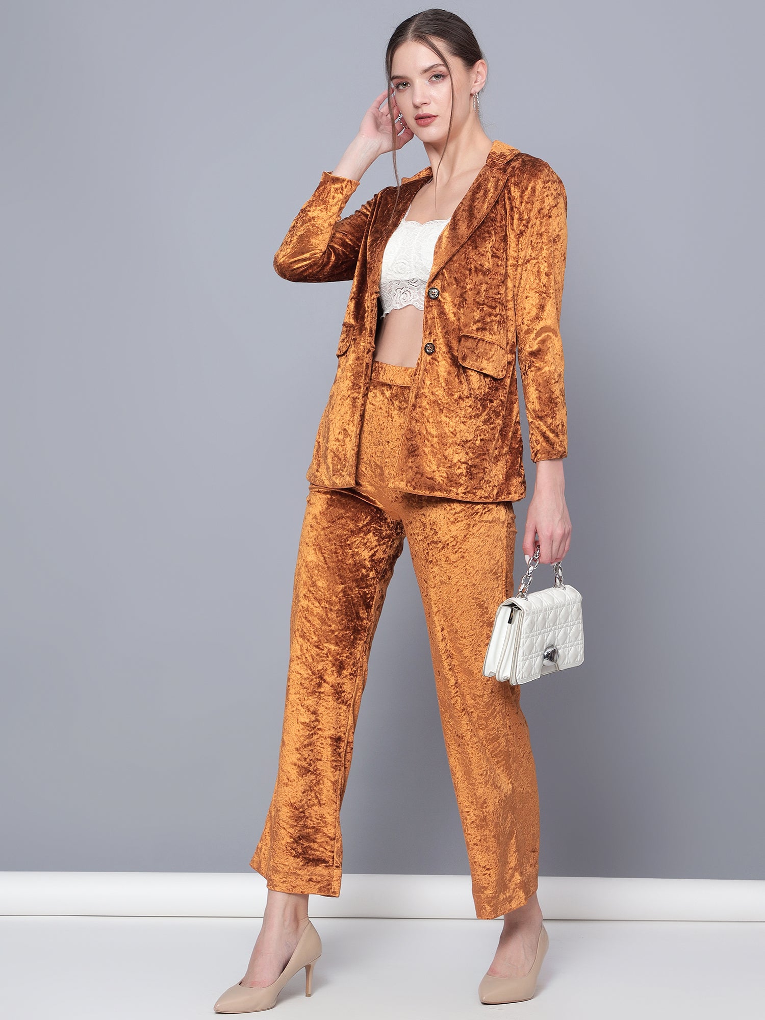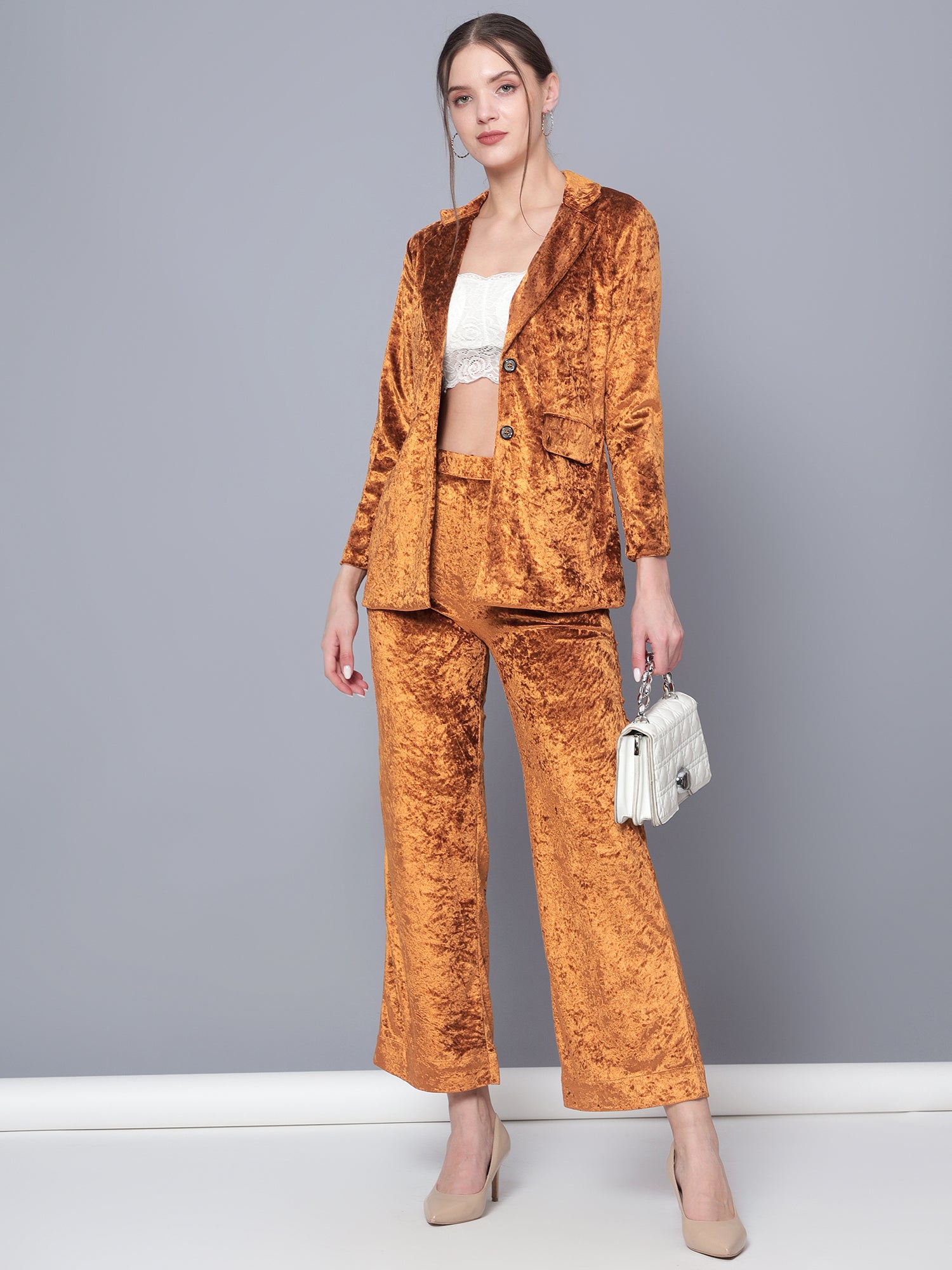 Get ready to slay in style with our Golden Kite Women's Velevet Blazer Coord Set! Textured Velvet Regular Single Breasted Formal Blazer, has long sleeves, an attached lining , button closure , Two pockets