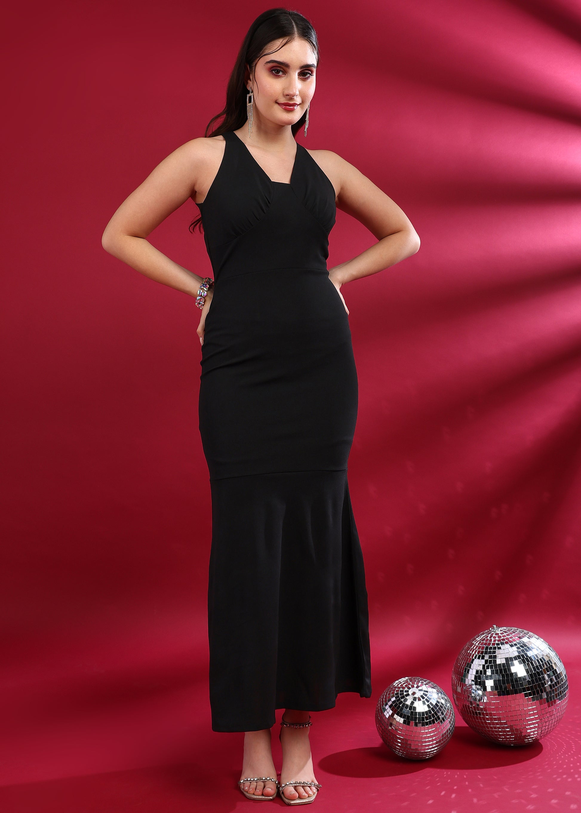 Golden Kite Women’s Front V-Neck Fish Cut Maxi Party Wear Dress with Back Bow Detail