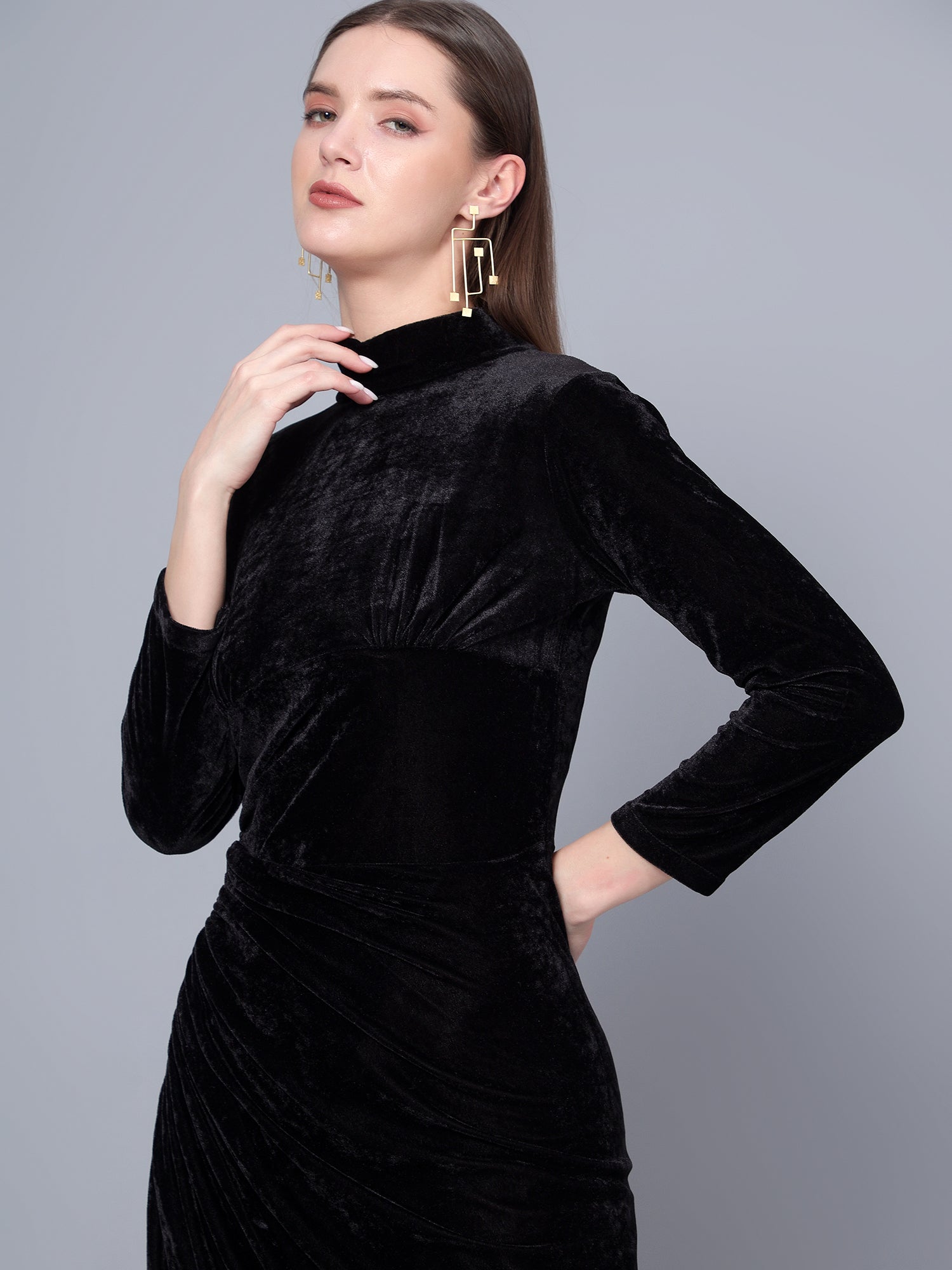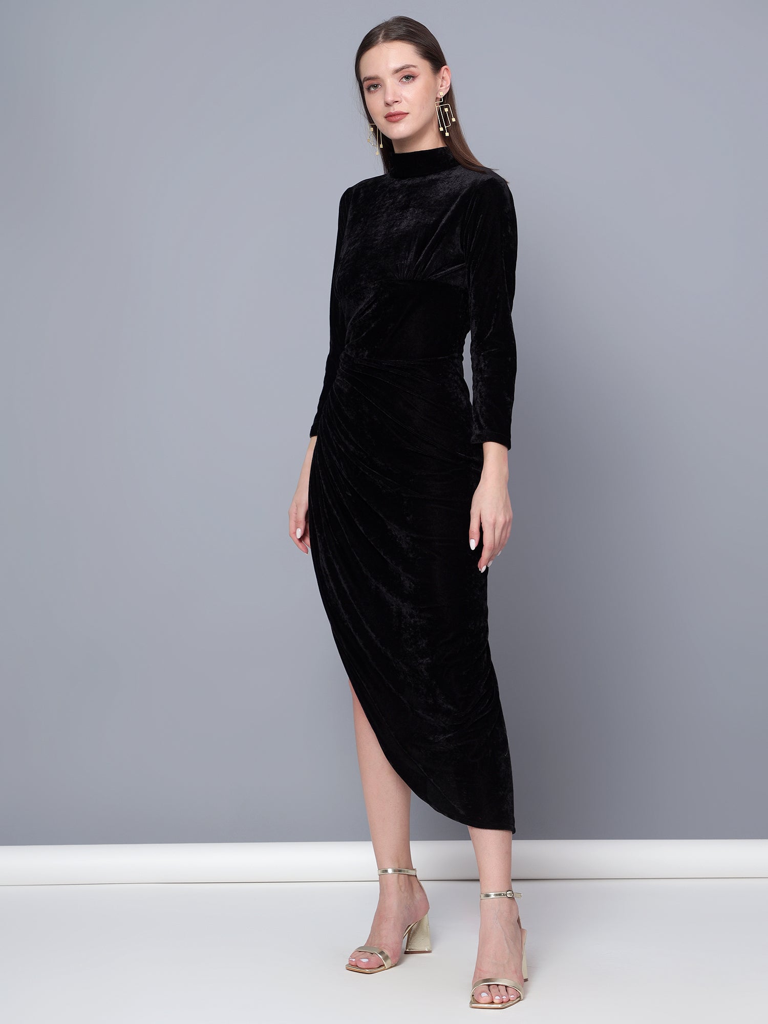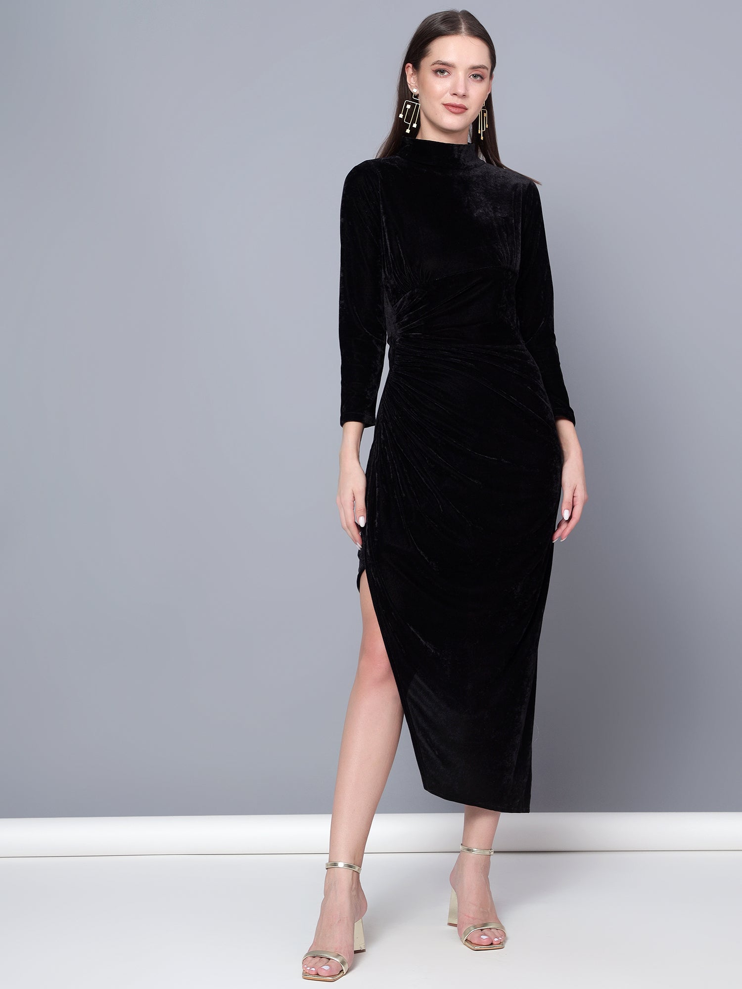 Golden Kite women solid high-neck gather detail maxi dress with side slit ,full sleeve velvet dress Look feminine and chic by donning this alluring dress to your next outing. Crafted with a solid pattern and a high neck, this piece lends you a flattering silhouette.