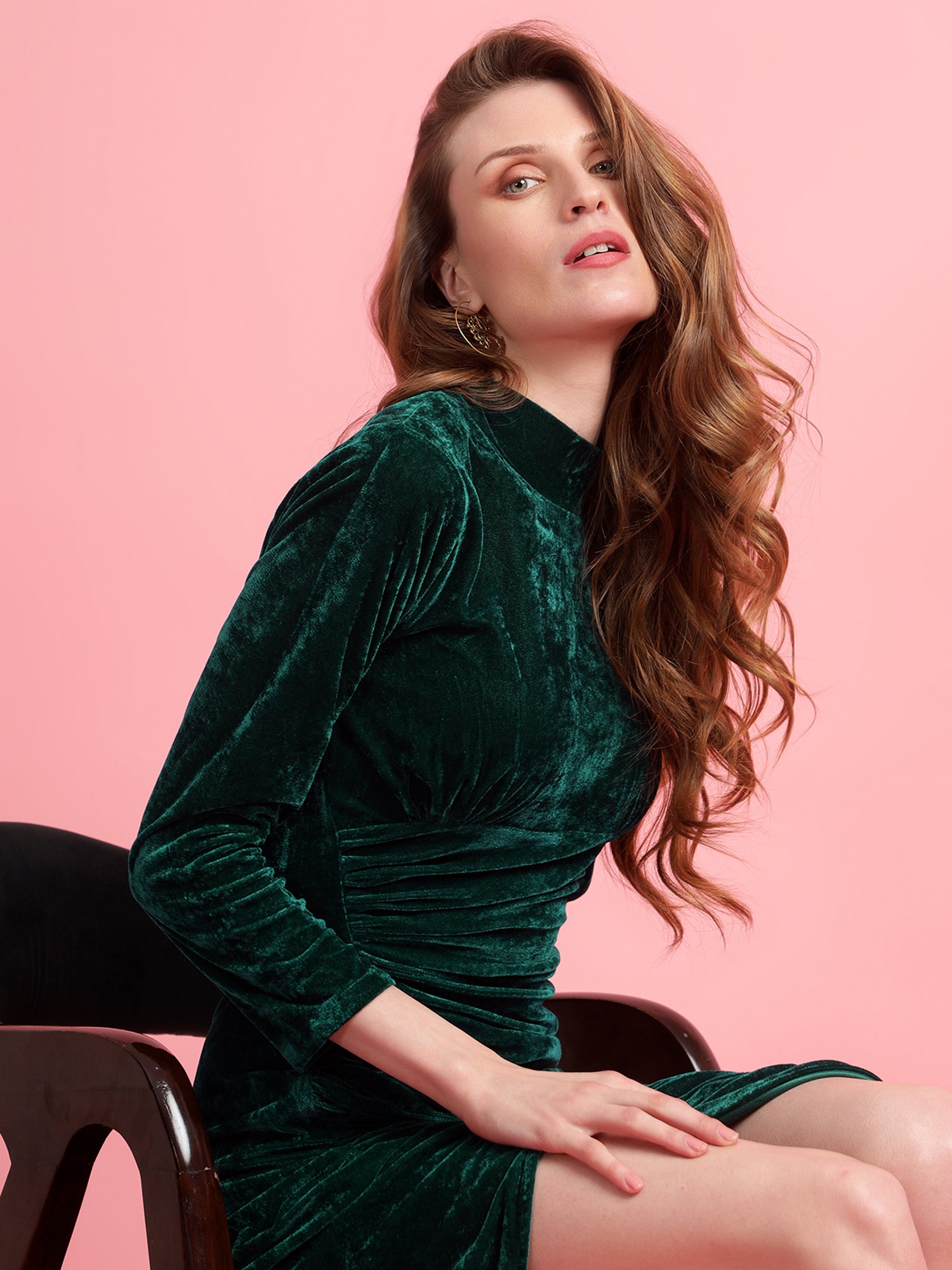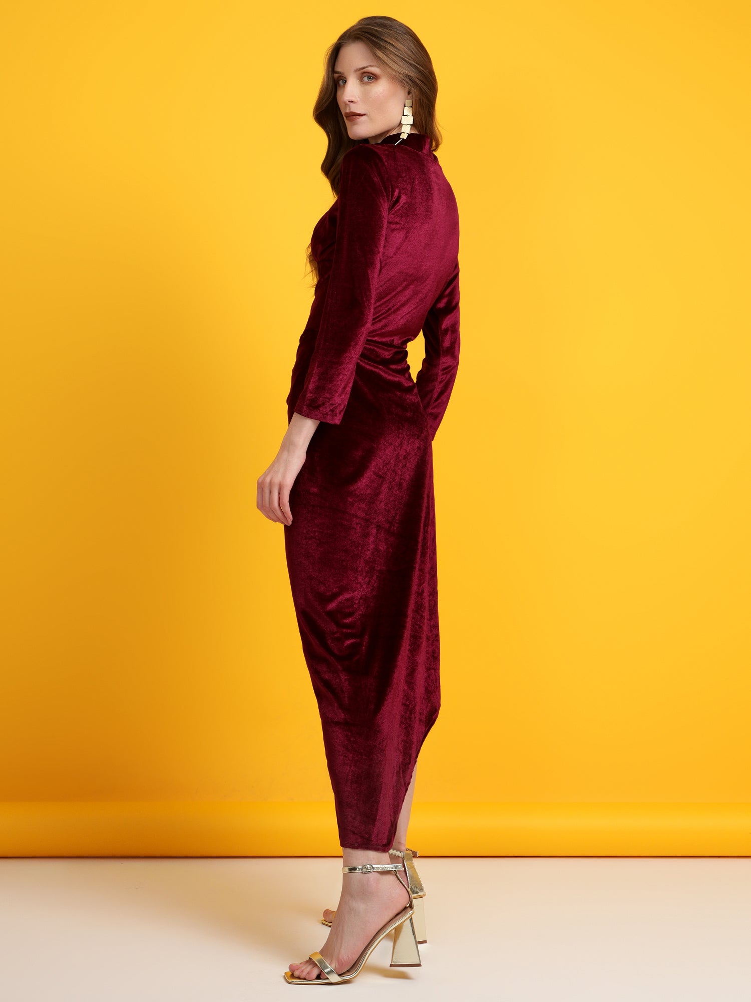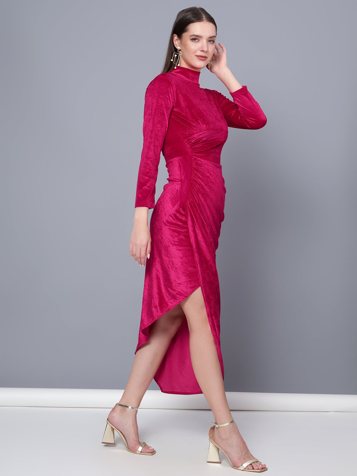 Golden Kite women solid high-neck gather detail maxi dress with side slit ,full sleeve velvet dress Look feminine and chic by donning this alluring dress to your next outing. Crafted with a solid pattern and a high neck, this piece lends you a flattering silhouette.