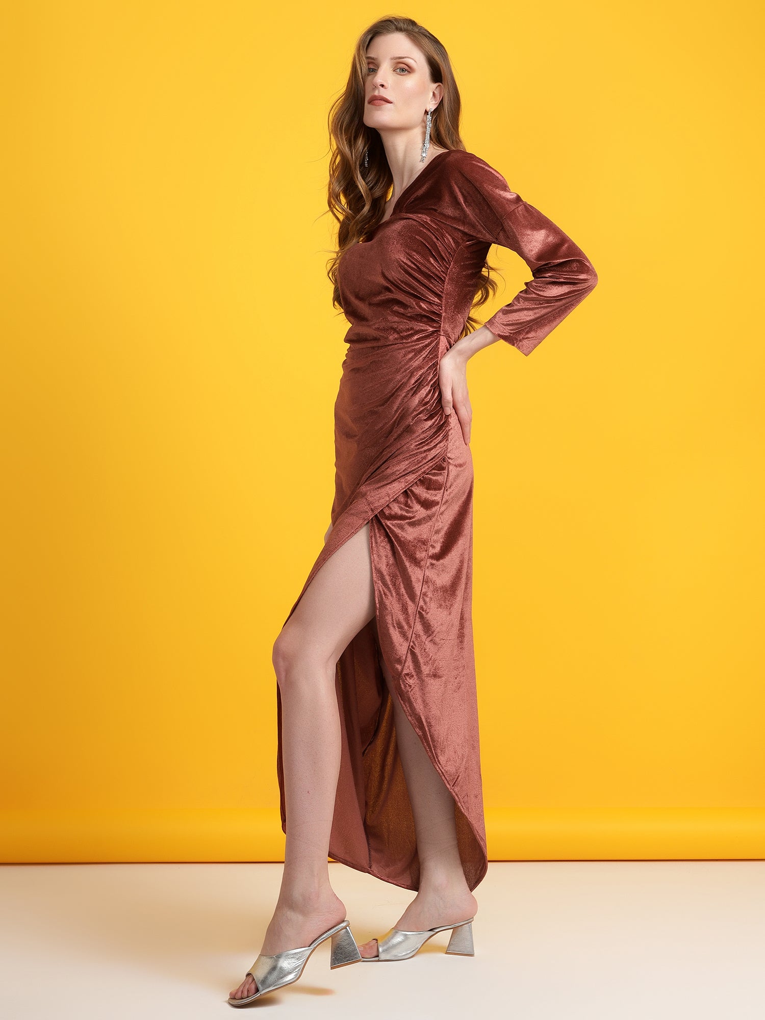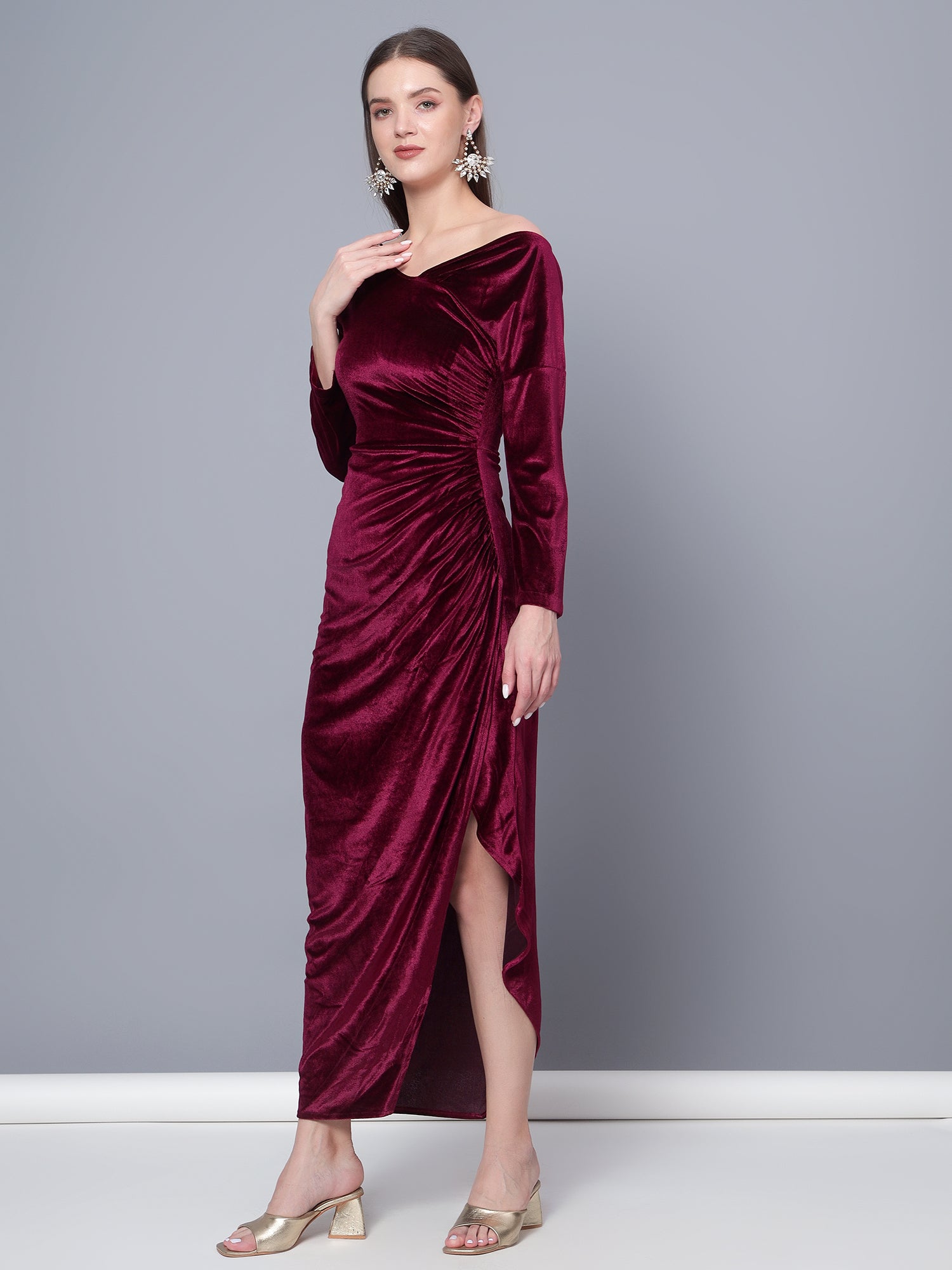 Golden Kite Women off shoulder Neckline has a trendy side slit velvet maxi dress Keep reinventing your look to stay up-to-date with fashion with this trendy dress. Its solid pattern, off-shoulder neckline, and curved hemline enhance its overall style factor. Solid Trendy dress