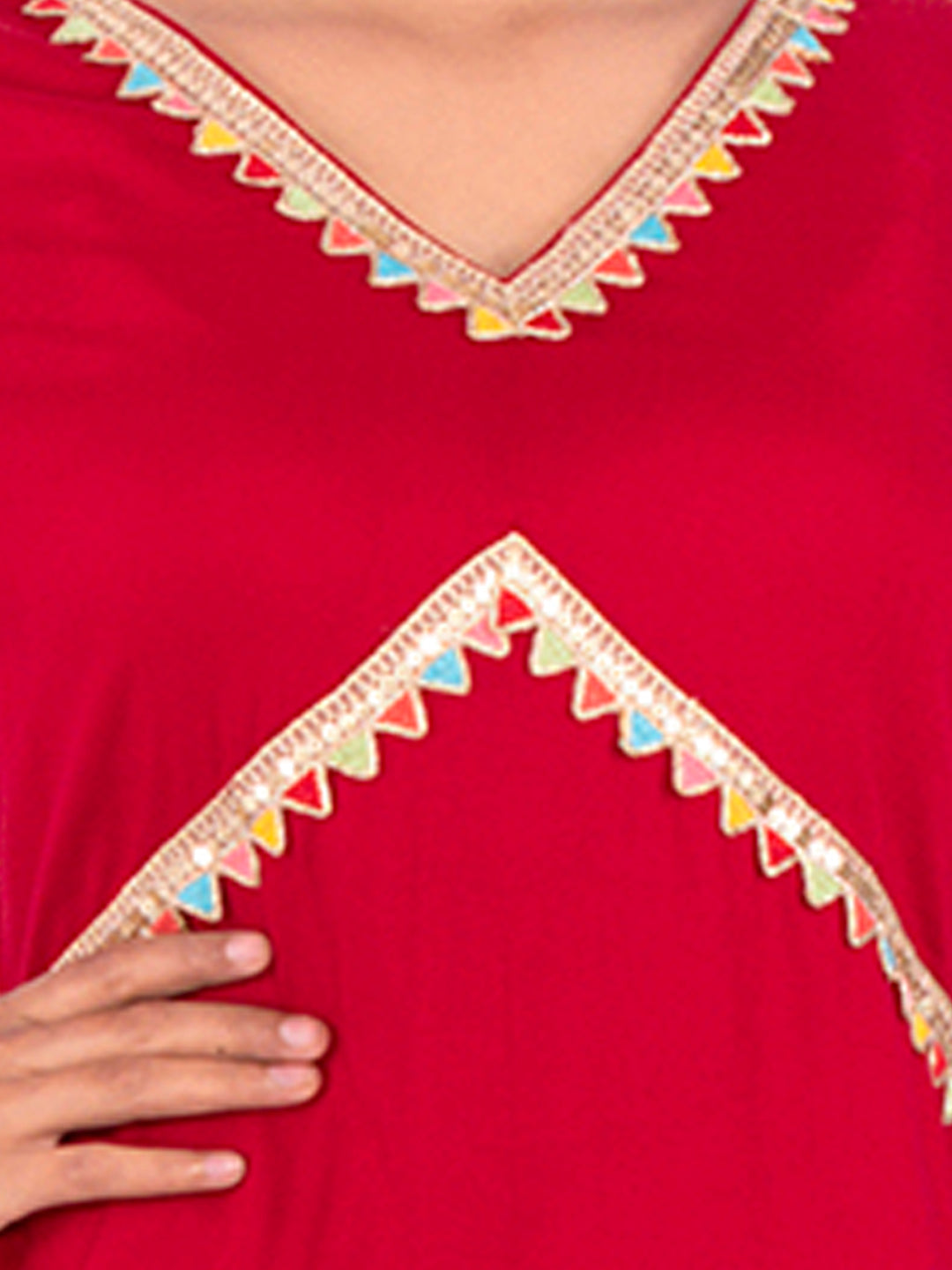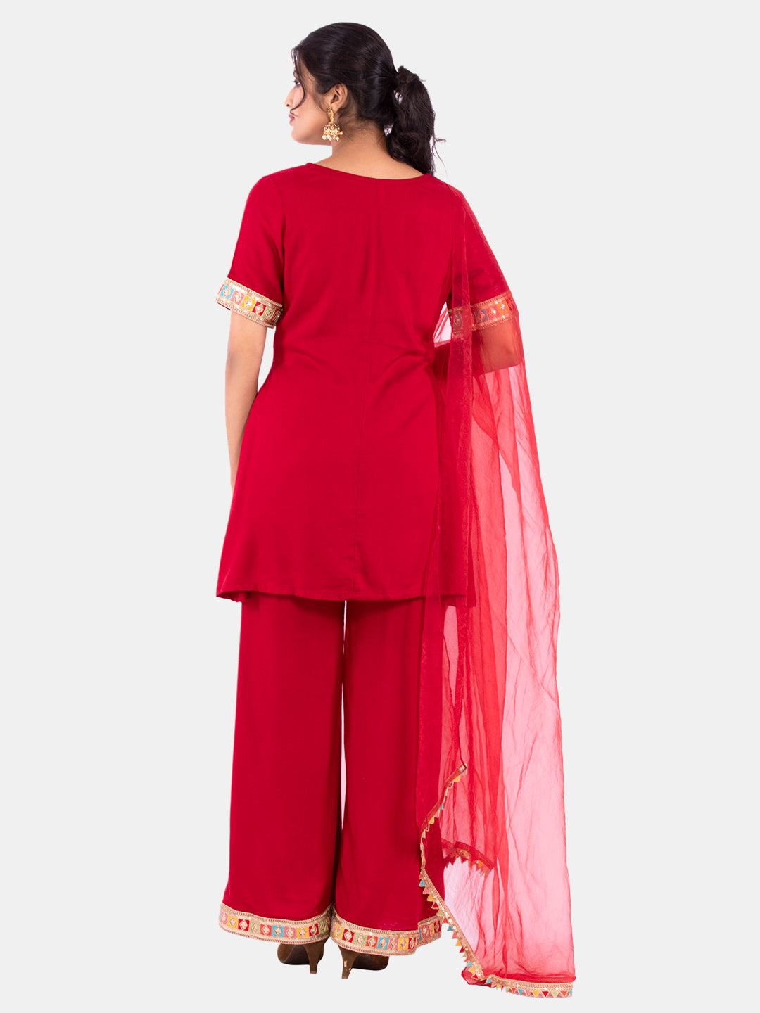 Golden Kite Women’s Rayon Solid Kurti, Palazzo & Dupatta Set Elevate your ethnic wardrobe with this timeless 3-piece set from Golden Kite, designed to bring elegance and comfort together. Crafted in soft rayon fabric, the Short-length solid kurti features a graceful V- neckline for a touch of sophistication. The set comes with flowy palazzo pants that ensure ease of movement, and a complementing dupatta adorned with embellished lace detail, adding a festive sparkle to the overall look.Perfect for festive occasions, family gatherings, or casual celebrations, this ensemble effortlessly blends tradition with modern style. Pair it with ethnic earrings and juttis to complete your graceful look.