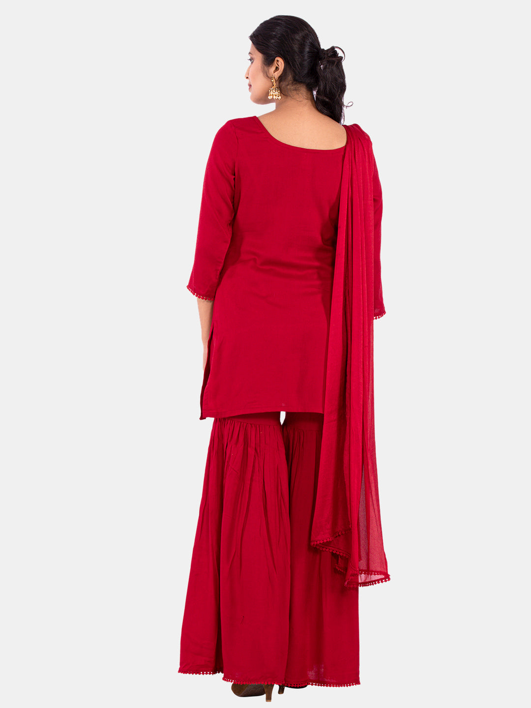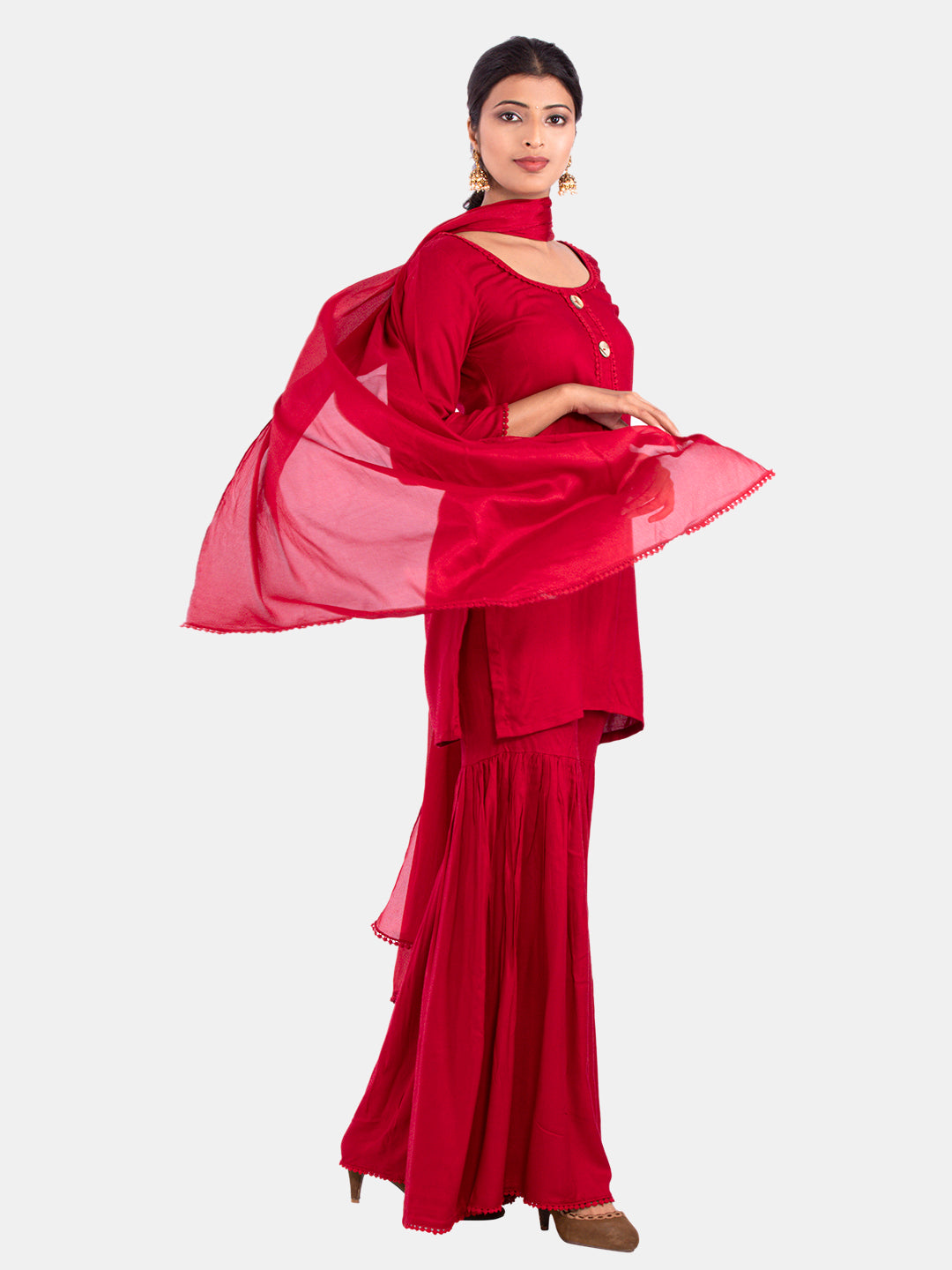 Golden Kite Women’s Rayon Solid Kurti, Sharara & Dupatta Set Elevate your ethnic wardrobe with this timeless 3-piece set from Golden Kite, designed to bring elegance and comfort together. Crafted in soft rayon fabric, the Short-length solid kurti features a graceful Round- neckline for a touch of sophistication. The set comes with flowy Sharara pants that ensure ease of movement, and a complementing dupatta adorned with embellished lace detail, adding a festive sparkle to the overall look.Perfect for festive occasions, family gatherings, or casual celebrations, this ensemble effortlessly blends tradition with modern style. Pair it with ethnic earrings and juttis to complete your graceful look.