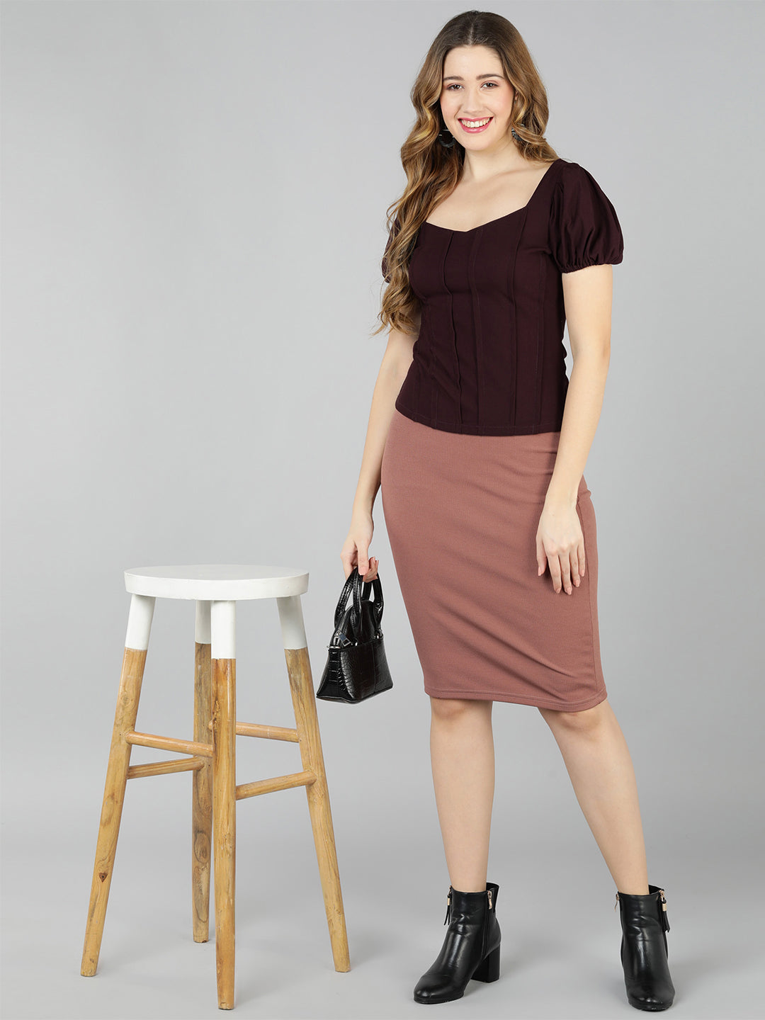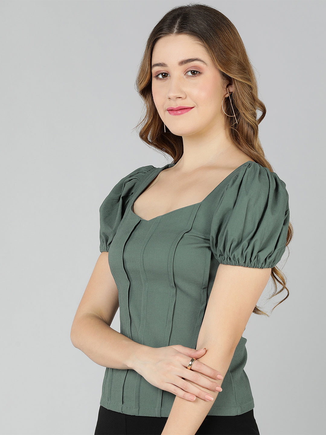 Golden Kite Solid Sweatheart Neck Top ,front corset , puffy sleeve ,Crafted in Scuba knit Jazz up your collection of casual ensembles with this stylish top . flaunting front corset look with puffy shoulders and a textured smooth finish , it will lead you a structured and sharp look     Â